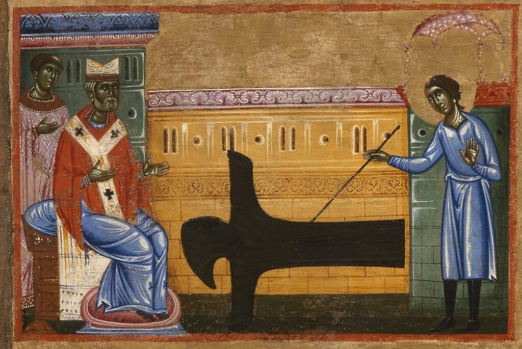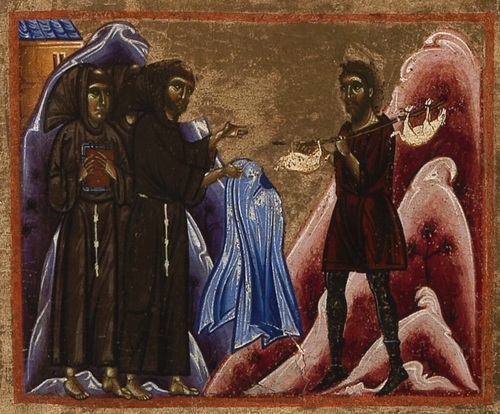 A obra se apresenta como uma verdadeira ícone. A vida exemplar de São Francisco é proposta para veneração e imitação. O cartilho é sustentado por uma mão (a de Deus) e é destacado pela presença de dois anjos que o indicam, quase convidando os espectadores a ouvirem e imitarem Francisco. O texto remete ao evangelho que descreve a Transfiguração do Senhor (Mt 17,5), onde Deus exorta os Apóstolos a ouvir o Seu Filho. O cartilho, portanto, é um convite a seguir os dogmas de vida, isto é, os preceitos e ensinamentos de vida, uma vez que são as palavras de Deus, que Francisco (novo evangelista, segundo Tomás de Celano) não escreve, mas transmite. O modelo é formado pelas palavras de Cristo: o Evangelho e as normas ali contidas.