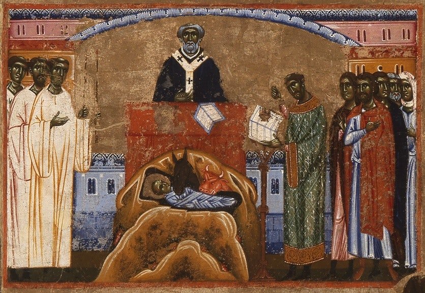 A obra se apresenta como uma verdadeira ícone. A vida exemplar de São Francisco é proposta para veneração e imitação. O cartilho é sustentado por uma mão (a de Deus) e é destacado pela presença de dois anjos que o indicam, quase convidando os espectadores a ouvirem e imitarem Francisco. O texto remete ao evangelho que descreve a Transfiguração do Senhor (Mt 17,5), onde Deus exorta os Apóstolos a ouvir o Seu Filho. O cartilho, portanto, é um convite a seguir os dogmas de vida, isto é, os preceitos e ensinamentos de vida, uma vez que são as palavras de Deus, que Francisco (novo evangelista, segundo Tomás de Celano) não escreve, mas transmite. O modelo é formado pelas palavras de Cristo: o Evangelho e as normas ali contidas.