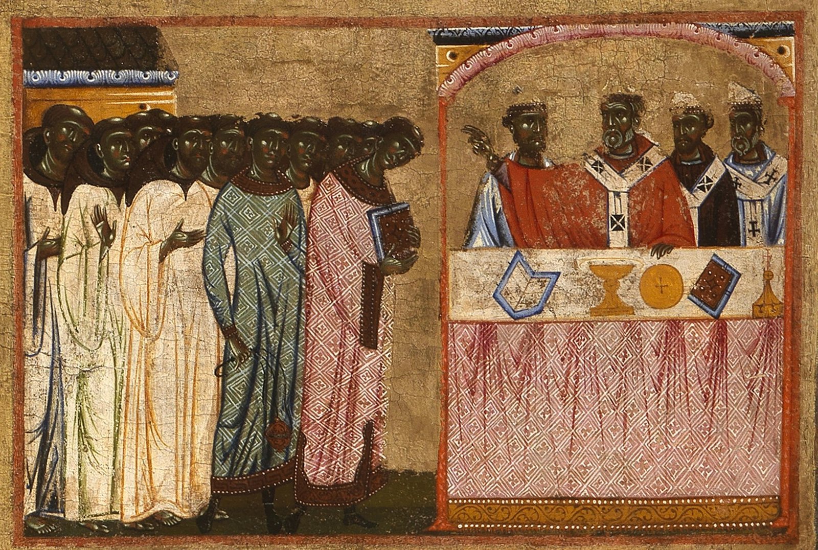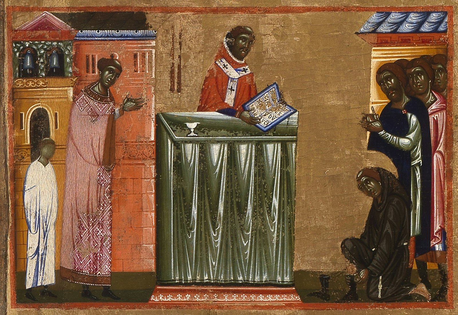 Os frades que aparecem nas intersecções das molduras, aclamando as várias histórias, respondem ao comando divino e convidam a expandir o consenso exigido pela imagem. “O Pai permitiu que o Filho se oferecesse no altar da cruz… deixando a nós o exemplo para que pudéssemos seguir suas pegadas…”, disse Francisco na Lettera a tutti i Fedeli; essas palavras podem ser repetidas como um resumo comentado para esta pintura.