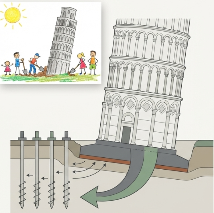 O colapso catastrófico do Campanário de São Marcos, em Veneza, em 1902, foi o alerta que fez Pisa perceber que seu próprio símbolo era mortal. Essa percepção deu início a um século de estudos urgentes para salvar a torre. Na década de 1990, a situação tornou-se crítica. A inclinação atingiu 5 graus, e o risco de colapso forçou seu fechamento ao público. Após inúmeras tentativas fracassadas, a solução vencedora foi contraintuitiva e elegantemente simples.